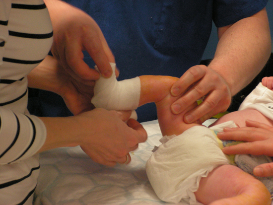 4: Abi, Children Physiotherapist Specialist, starts treatment. A layer of paddingl protects the skin underneath the plaster
